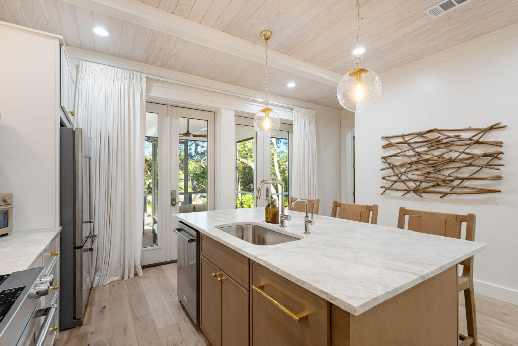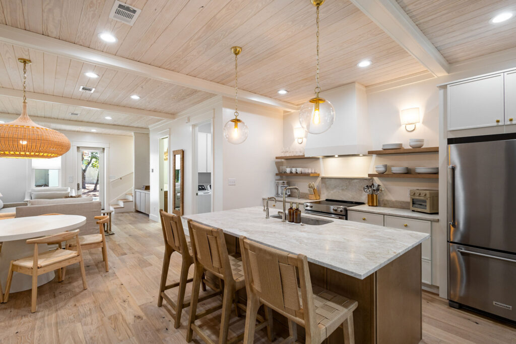 This home sits on a quiet lot and backs up to one of the rare Coastal Dune Lakes here on 30A. These lakes connect to the Gulf, creating a unique mix of fresh and salt water. Because of that, they’re incredible for fishing and paddleboarding, which we made sure to set up for our guests.